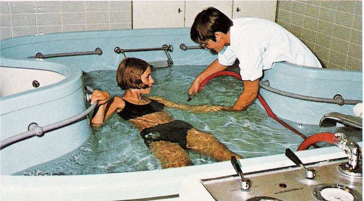 Zwei goldene Schlüssel prangen auf dem Wappen von Ankt-Peter Ording. So trägt auch die 1913 hier eröffnete Nordsee-Kurantalt den passenden Namen “Goldene Schlüssel”. Diese übernimmt 1956 das DRK-Landesverband. In den 1950er bis 1970er Jahren wird das Haus mehrfach baulich erweitert und therapiebegleitenden Installationen ausgestattet: ein eigens gebohrter Brunnen liefert ab 1958 beispielsweise Meerwassersole für Bäderanwendungen. Auch Wannenbäder, Bewegungsbad, Inhalatorium, Bestahlungs-, Massage-, Sport- und Gymnastikräume sowie eine Saunaanlage in den Dünen gehört zu den Therapieangeboten.
