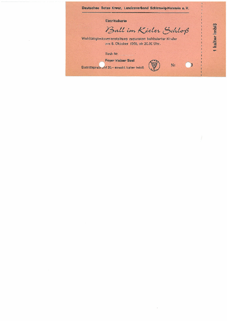 Der erste Wohltätigkeitsball des Deutschen Roten Kreuzes findet im November 1966 in den neuen Räumlichkeiten des Kieler Schlosses statt und damit beginnt eine Serie erinnerungswürdiger, glanzvoller Veranstaltungen mit großer Show, Tanz und Tombola, die einmal im Jahr namhafte Gäste aus der Politik, der lokalen Wirtschaft sowie hochkarätige internationale Persönlichkeiten aus Funk und Fernsehen nach Kiel lockt. Der Wohltätigkeitsgedanke ist neben all der Ausgelassenheit der Motor der Veranstaltung: Bereits im Vorfeld des Events sammelt das DRK Spenden und verfügt so beispielsweise im Jahr 1966 bereits über 50.000 DM, noch bevor das Tanzorchester des Norddeutschen Rundfunks und das Ballett des Kieler Stadttheaters den Abend eröffnen. Zur langen Liste der internationalen Spender*innen des ersten Rotkreuzballs gehören unter anderem Aristoteles Onassis (4.000 DM) und die Kieler Howaldtswerke (3.000 DM). Unternehmen von Schleswig-Holstein bis Bayern steuern außerdem Gewinne für die große Tombola des Rotkreuzballs bei. Die Spendenerlöse der Rotkreuzbälle tragen einen erheblichen Teil zur Finanzierung des DRK-Schul- und Therapiezentrums in Raisdorf im Jahre 1972 bei. Nach 24 Jahren findet der letzte Rotkreuzball im Jahr 1990 statt.