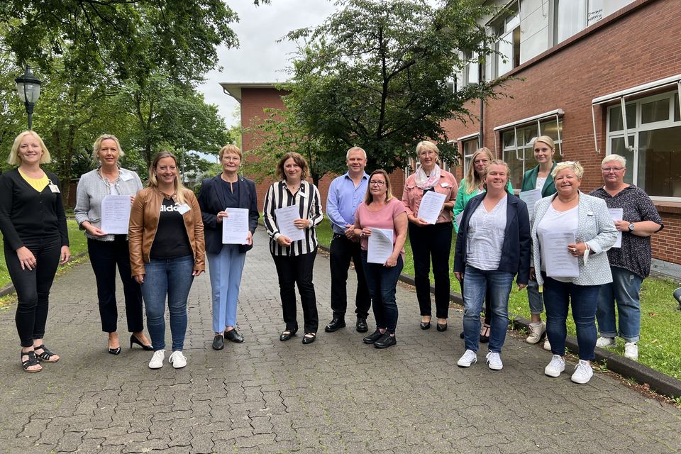 Ines Dreier arbeitet als Pflegebereichsleiterin an den Westküstenkliniken. Eine ihrer Aufgaben ist es, Kooperationsverträge mit Trägern von ambulanten Pflegediensten oder anderen Pflegeeinrichtungen abzuschließen. Denn mit der Einführung der generalistischen Pflegeausbildung müssen die Pflegeschüler*innen der Westküstenkliniken auch in der ambulanten und stationären Langzeitpflege ihre Praxiseinsätze absolvieren - und deren Schüler*innen im Krankenhaus. "Wir hatten in den vergangenen zwei Jahren mehr als 70 einzelne Vereinbarungen geschlossen, in denen diese Einsätze geregelt worden sind", erzählt Ines Dreier. "Das war sehr aufwändig." Damit soll jetzt aber Schluss sein. Die Westküstenkliniken haben gemeinsam mit dem Deutschen Roten Kreuz sowie sechs weiteren Trägern von ambulanten und stationären Langzeiteinrichtungen einen Verbundvertrag geschlossen. In diesem werden die Praxiseinsätze der Pflegeschüler*innen aus dem Krankenhaus, des DRK sowie anderer Pflegeheime und Betreuungseinrichtungen einheitlich und verbindlich geregelt. Zu den Partnern gehören neben den Westküstenkliniken (WKK) sowie der DRK Akademie SH in Heide auch die DRK Kreisverbände Dithmarschen und Nordfriesland, der Kirchenkreis Dithmarschen, die Stiftung Mensch, der Pflegedienst "To huus" sowie Vitacare, die in Brunsbüttel das Haus am Deich betreiben. Bei der Vertragsunterzeichnung im Bildungszentrum der Westküstenkliniken in Heide unterstrichen die Vertreterinnen und Vertreter aller Vertragsparteien die Bedeutung des Vertrages für die Nachwuchsgewinnung. Anette Langner, Vorstand (Sprecherin) des DRK-Landesverbandes Schleswig-Holstein, sieht in dem Vertrag einen Beitrag zur Steigerung der Attraktivität des Pflegeberufes und der Zufriedenheit der Schüler*innen. "Wir stehen in der Pflege vor der enormen Herausforderung, Nachwuchs zu gewinnen. Mit dem gemeinsamen Vorgehen bei der Ausbildung schaffen wir attraktive Rahmenbedingungen", sagte Anette Langner. Die Pflegedirektorin der Westküstenkliniken, Sabine Holtorf, unterstrich die Bedeutung der Kooperation und bezeichnete den Vertrag als "absolut sinnvoll. Der zunehmende Mangel an Pflegekräften ist eine Bedrohung, der wir nur gemeinsam begegnen können. Daher freue ich mich, dass wir zu dieser Vereinbarung gekommen sind", sagte Sabine Holtorf. Der jetzt geschlossene Verbundvertrag ist in dieser Form landesweit einmalig. Durch die Beteiligung der Westküstenkliniken sowie des DRK in Schleswig-Holstein steht den Schüler*innen der Vertragspartner ein breites Spektrum an Einrichtungen im gesamten Land für die verpflichtenden Praxiseinsätze zur Verfügung.